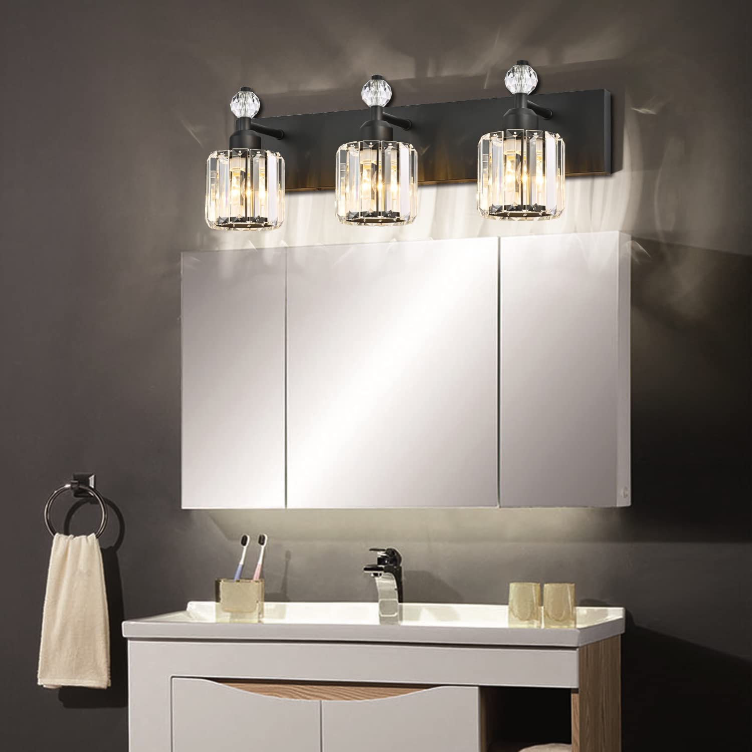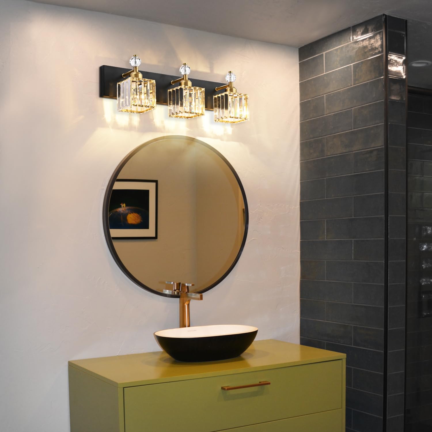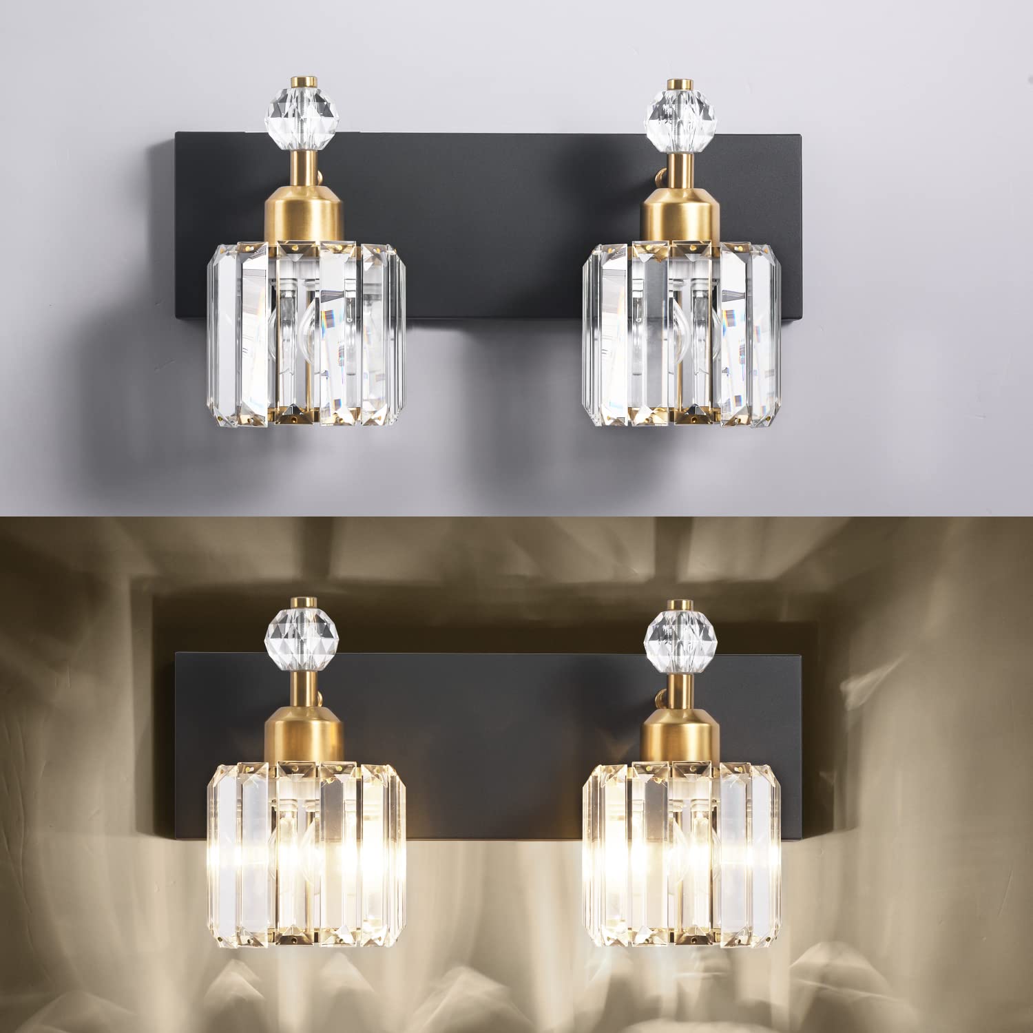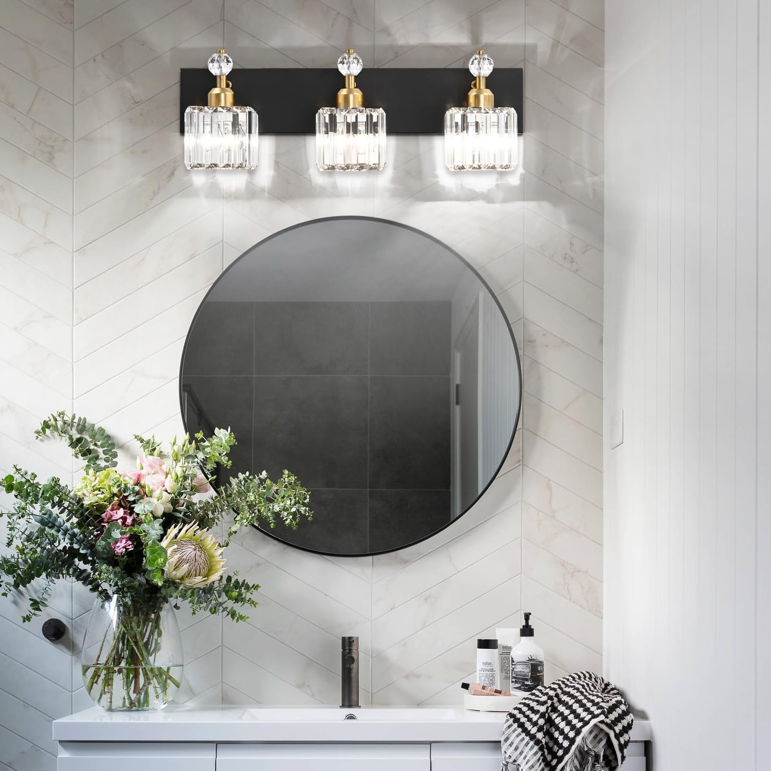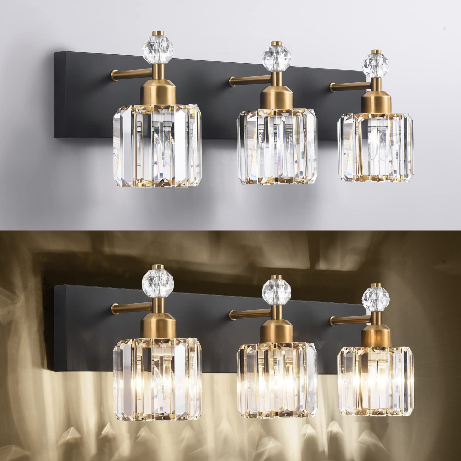 PRESDE Black Gold Crystal Bathroom Vanity Lights Fixtures Over Mirror Modern 3 Light Bath Wall Lighting