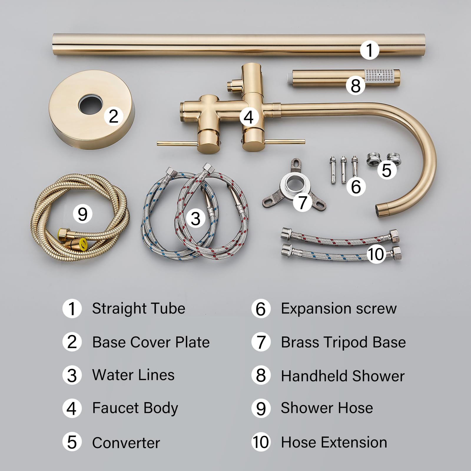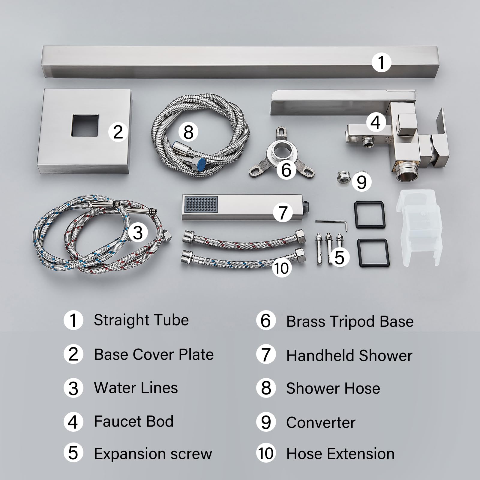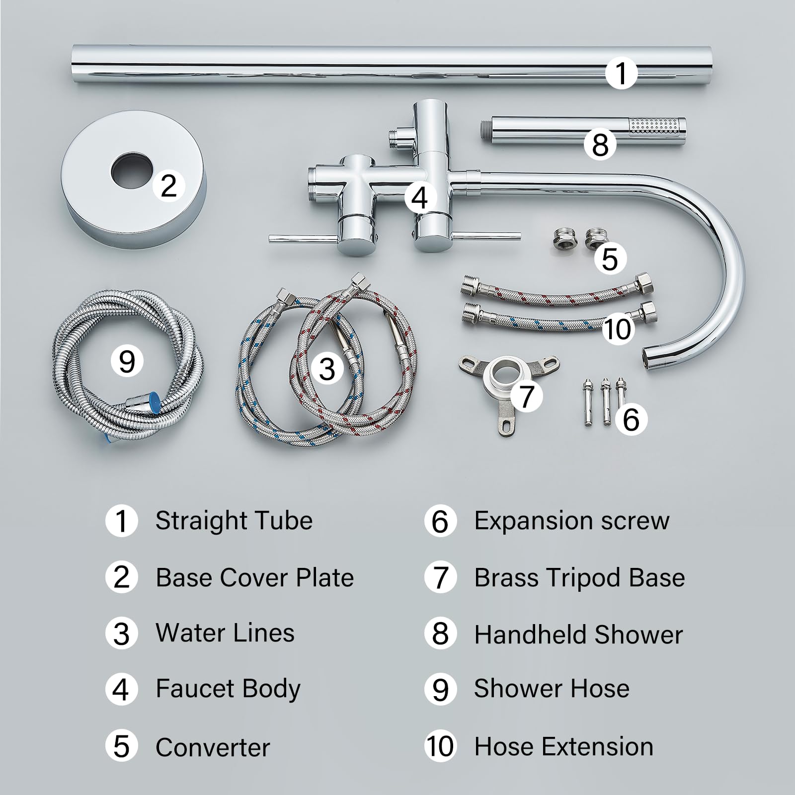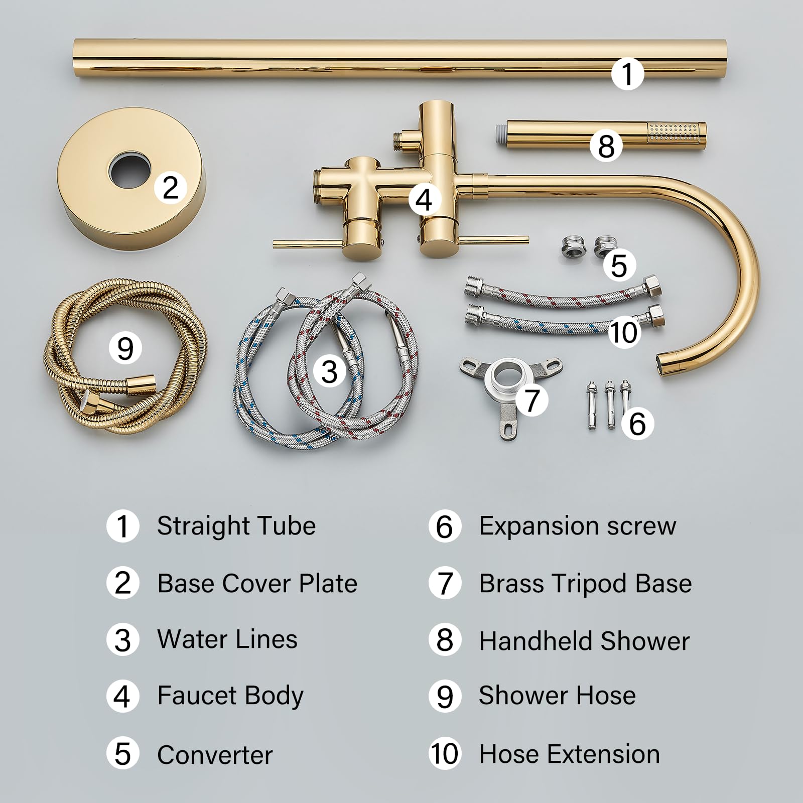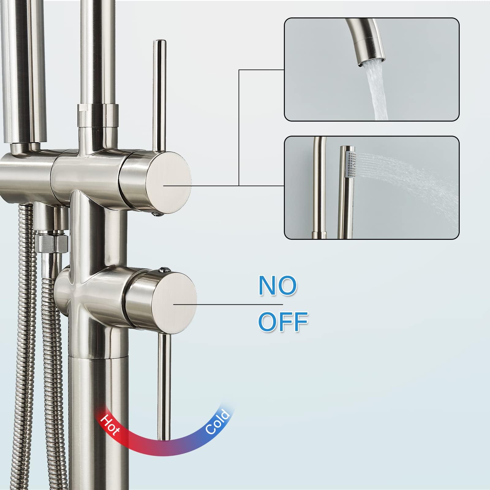 - 【Floor Mount Tub Filler Installation】:59"(150cm) shower hose,Hot & Cold Waterlines 1/2’’ Hose Connection Design(3/8 thread adapter and 1 pair 8 inch extension water hoses in package for different need),Includes Bracket and Bolts(3pcs).Include all the installation hardware.